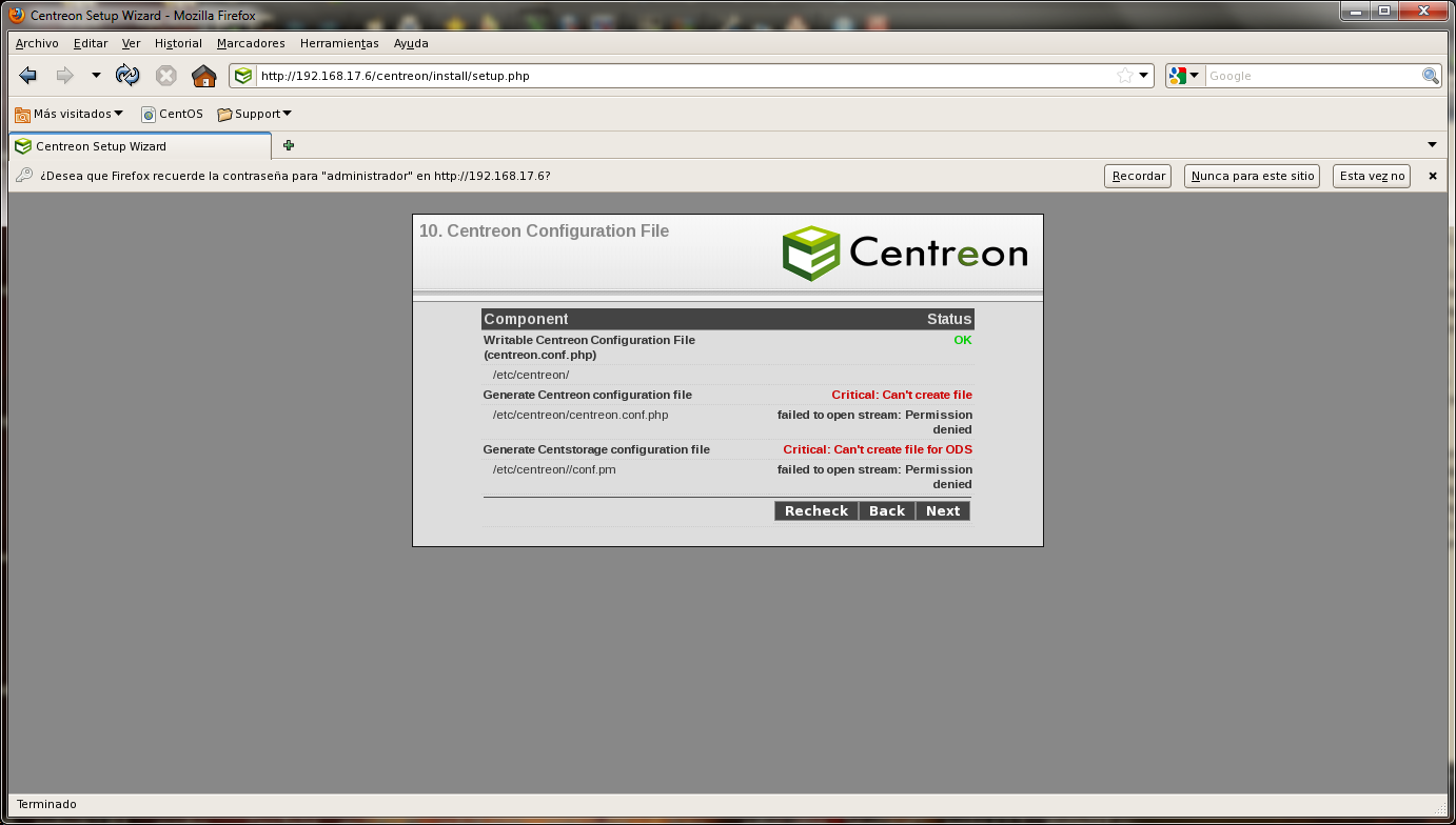 Comprobaremos que la carpeta /etc/centreon/ está creada, que los permisos son 755 o 775...que todo parece bien, además todos los demás checkeos están OK.
